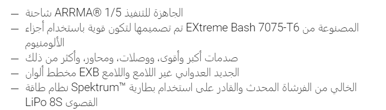 تتضمن المنصة المثالية بمقياس 1/5 للضرب وأداء الأعمال المثيرة الآن القوة القصوى لأجزاء EXB، ونظام Spektrum ™ 8S LiPo المعزز بدون فرشاة، وأكثر من ذلك بكثير - في حزمة مريحة وجاهزة للتشغيل محملة بالقيمة.