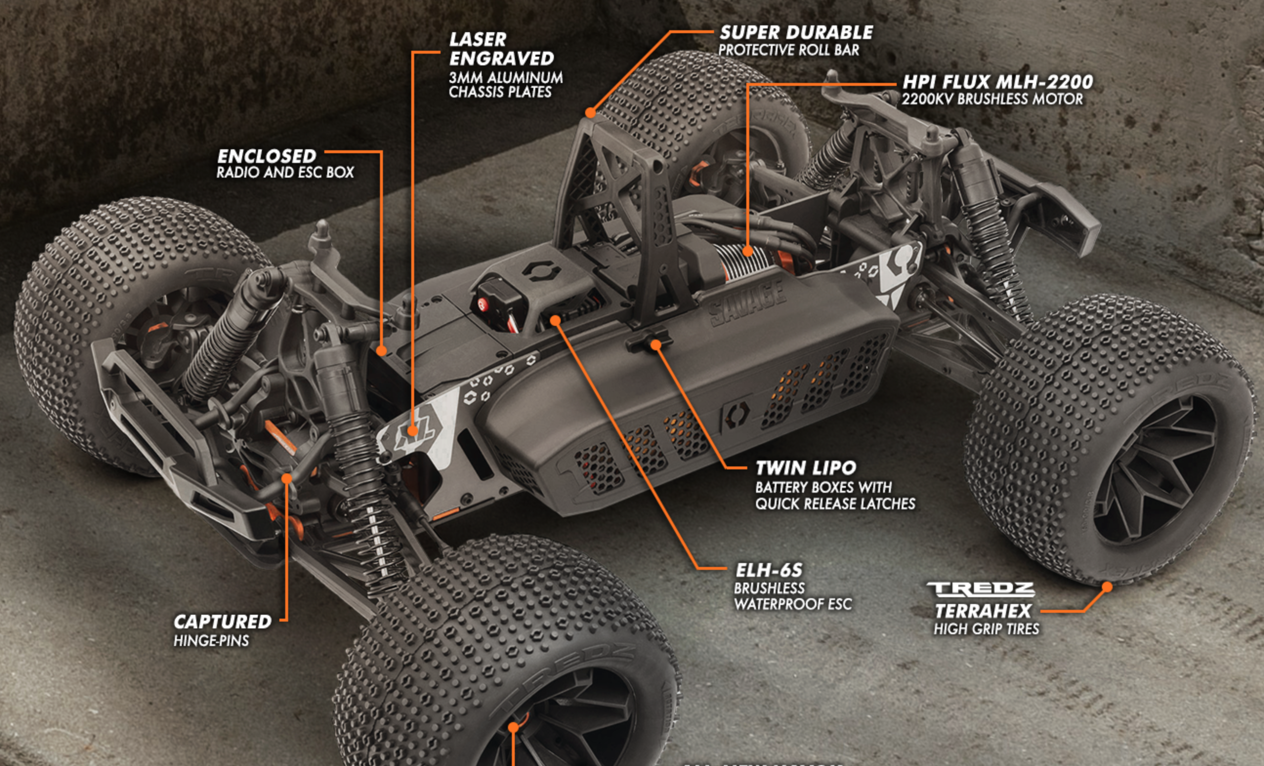 إطارات وعجلات جديدة كليًا يستحق Savage XL FLUX الجديد مجموعة جديدة من عجلات HPI Havok 3.8 بوصات شديدة العدوانية ، وملفوفة في إضافة أخرى إلى TREDZ "بواسطة HPI Racing". تم تصميم إطارات Tredz Terrahex مقاس 3.8 بوصات متينة ، ولكن من أجل خفة الحركة القصوى والتحكم بسرعات اهتزاز الأرض