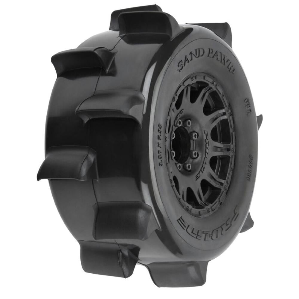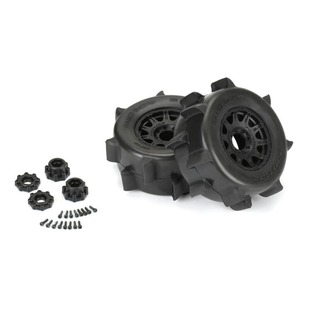Overview of the Sand Paw HP BELTED 3.8" Paddle Tires Mounted on 2 Removable 17mm Raid Black 8x32 Wheels 🏖️❄️🚗