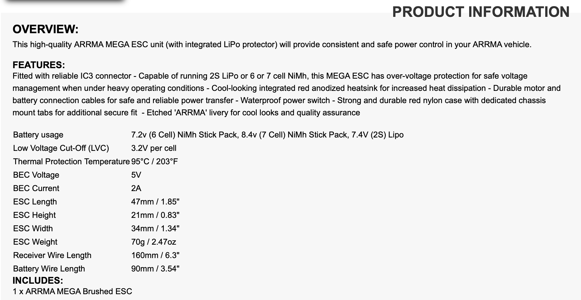 - Supports operation of 6 or 7-cell LiPo 2S or Nickel Metal Hybrid (NiMh) batteries