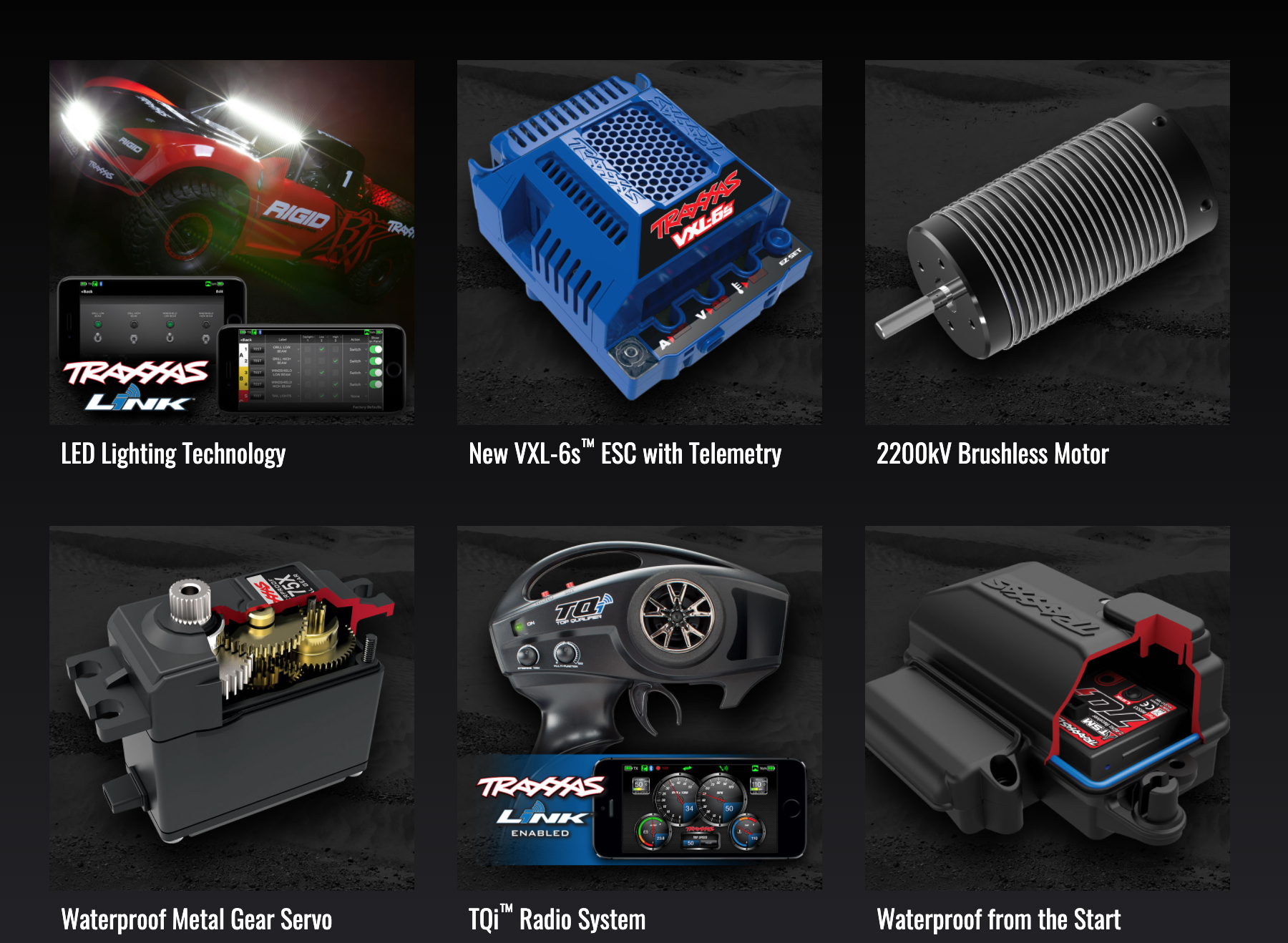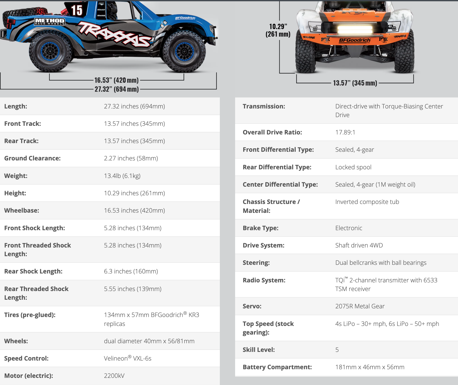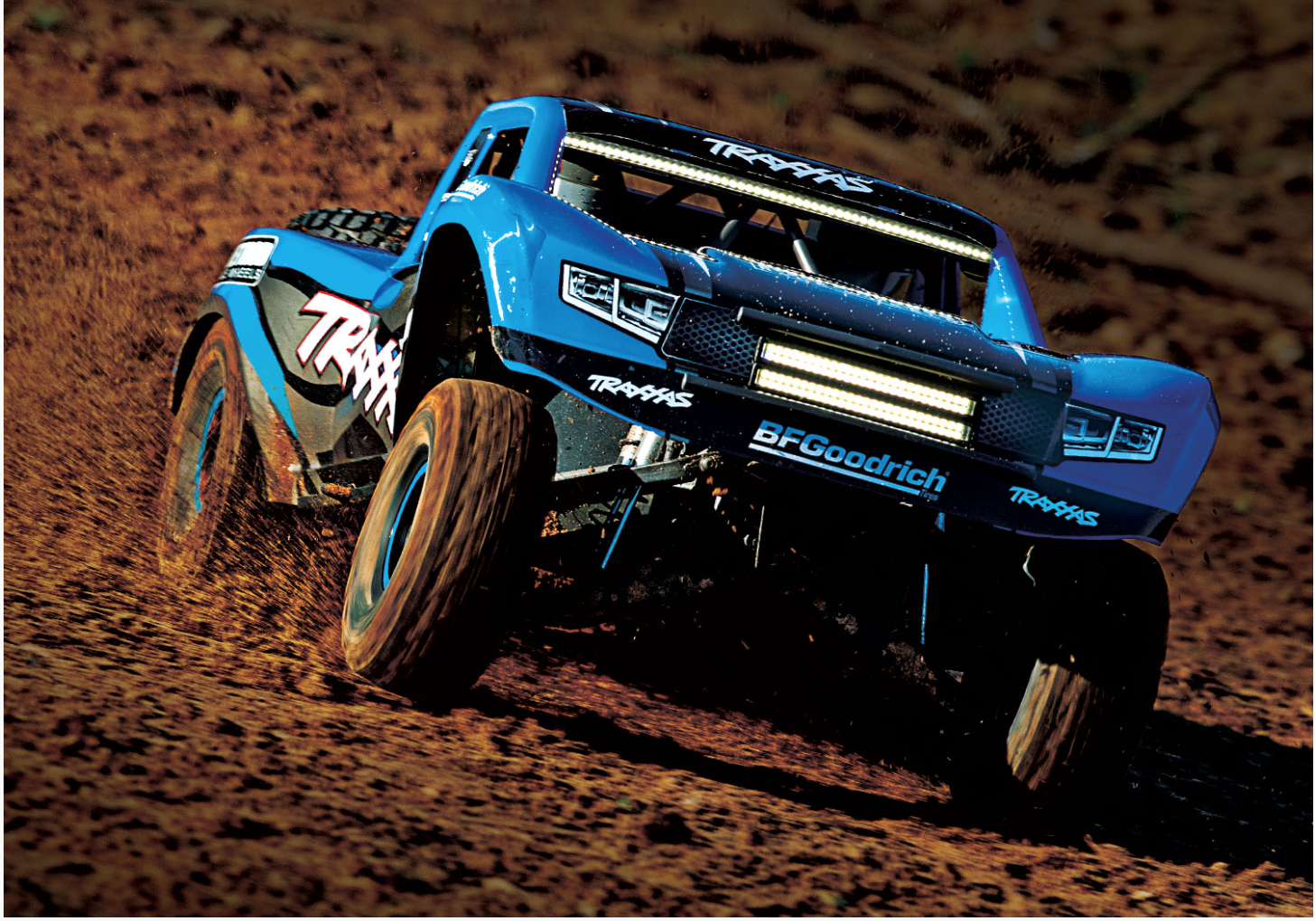 - Traxxas 85086-4 - Unlimited Desert Racer 4x4 SCT, LED Lights RTR, Rigid Features: High-Voltage LED Lights Curved roof light bar (52 LEDs) Multifunction red and amber brake light/class light bar High-voltage 8-channel power amplifier for intense, brilliant LED lighting VXL-6s Waterproof Electronic Speed Control Velineon 2200kV Brushless Motor Up to 50+ mph with Two 3s LiPo Batteries Traxxas Stability Management (TSM) Innovative Battery Compartment: Accommodates single 4-cell LiPo or dual 2-cell or 3- cell LiPo batteries Includes: (1) Unlimited Desert Racer 4WD Race Truck (1) Licensed Race Replica Painted Body (1) TQi 2.4GHz Radio System (1) 2200kV Motor (1) Velineon VXL-6s Brushless ESC (1) Factory-installed LED Light Set Specs: Length: 27.32” (694mm) Front track: 13.57” (345mm) Rear track: 13.57” (345mm) Ground clearance: 2.27” (58mm) Weight: 13.4lb (6.1kg) Height: 10.29” (261mm) ) Wheelbase: 16.53 " (420mm) Overall drive ratio: 17.89.1 Battery compartment: 181x46x56mm Part number(s) included (in factory packaging): 85086-4.