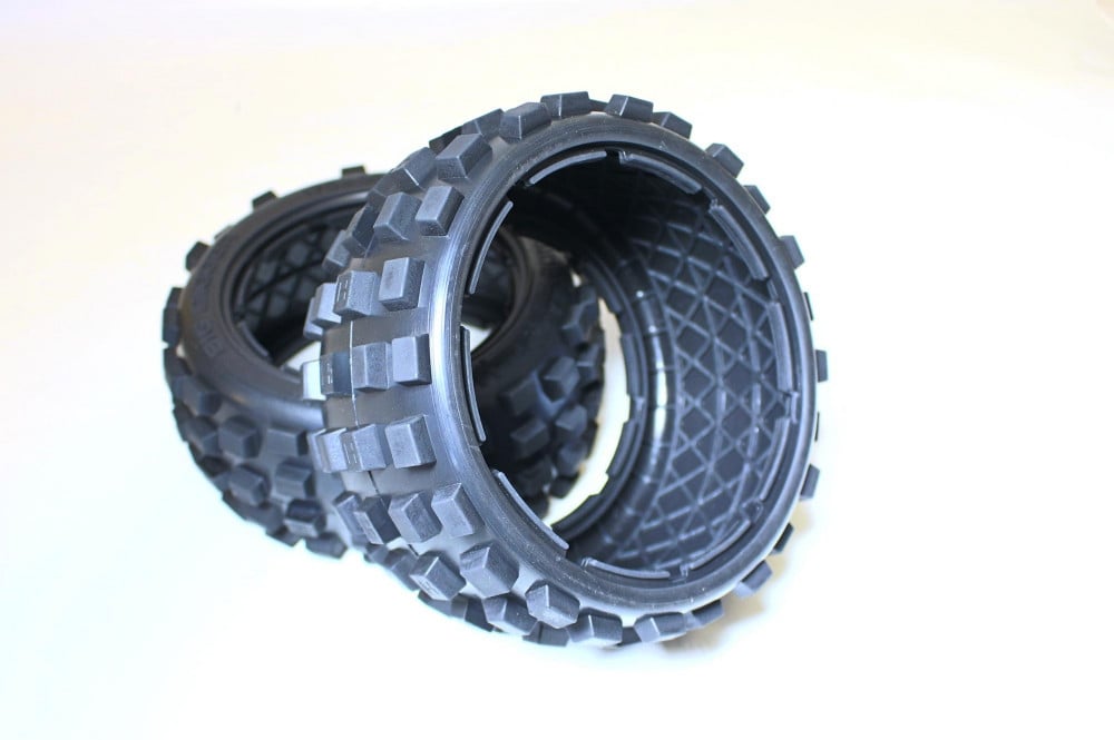 Featuring an aggressive block style lug these are ideal for loose dirt surfaces and grass. The tire is molded in a thick rubber and features internal webbing to help maintain tire shape at high speeds and in corners. The tire compound is a long lasting hard wearing rubber compound and is intended for off road use. Driving on paved/concrete surfaces will cause accelerated wear.