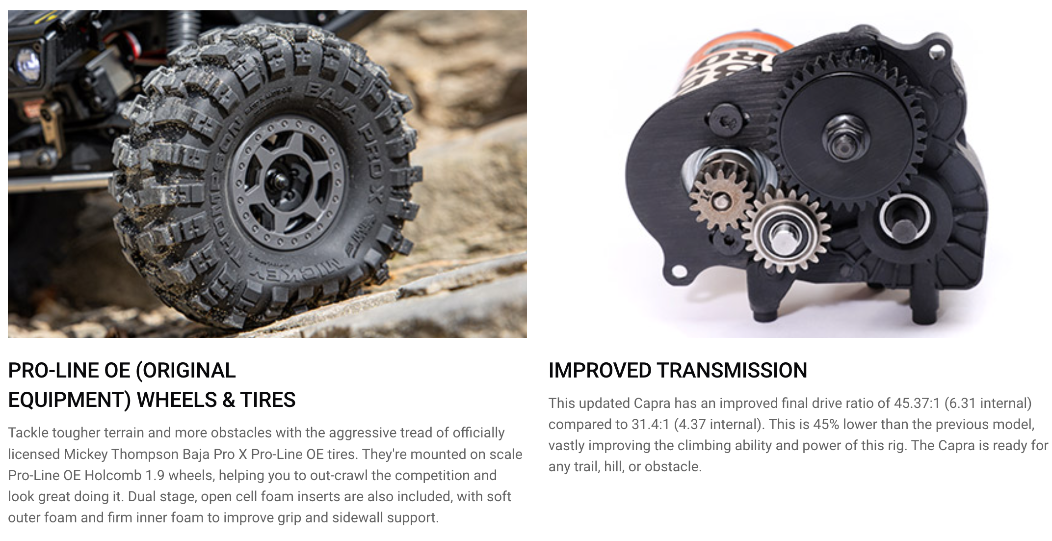 The Axial Capra is the trail buggy that changed the rules of the 1/10 category, and it's back with even more powerful upgrades, including a lower gear ratio transmission for superior climbing ability and control on the toughest trails and obstacles. Ready for any road, rock, or slope—no compromises.