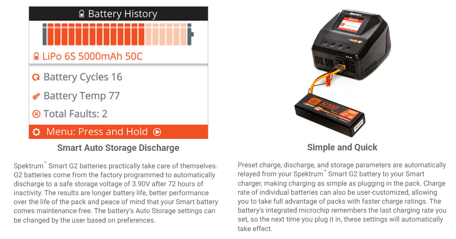 Note: Smart G2 batteries require the use of a Spektrum Smart Charger. Update your Spektrum Smart Charger for all the latest advancements in Smart Technology.